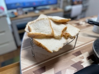 週一のお楽しみ😄夫が米粉パンを焼いてくれました♪ 米粉パンはモッチモチしてるのでパン切り包丁でもくっついて切りづらいんです💦 いつもは厚切りになりやすいのですが、本日は薄くて、外がカリッとモチモチで 美味しく頂きました😋