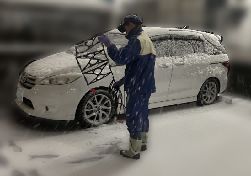車通勤の夫は明日の準備の為にチェーンを付けに駐車場へ!