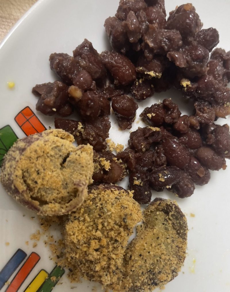 最近のブームがサツマイモのきな粉まぶして小豆を添え!